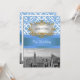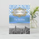 Ensemble de faire-part personnalisable avec vue emblématique sur la skyline de New York depuis le sommet du 30 Rockefeller Center, comprenant une photo en noir et blanc de l'Empire State Building, du bas de Manhattan, y compris le World Trade Center. Il présente également un motif damassé bleu et blanc, un ruban bleu clair ainsi qu'une étiquette dégradée blanche avec votre choix de cadre argenté ou doré.