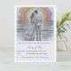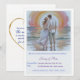 Une carte d'invitation de mariage boho simple et charmante d'un couple sur la plage au coucher du soleil sur un fond bleu clair