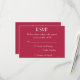 Créez votre propre carte d'invitation de réponse de mariage personnalisée, élégante, moderne, simple, magenta et blanche. Entrez simplement la date de réponse, la date du mariage et les noms des mariés. Pendant que vous personnalisez, vous pourrez voir un aperçu tout au long. Une réponse de mariage élégante pour tous vos amis et votre famille.