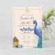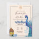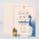 Lanternes marocaines, arche dorée, invitation de nikkah. Fond clair avec arrangements de fleurs séchées dans les coins avec des lanternes suspendues et un paon.