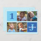 Invitation carrée cool pour 4 photos pour l'anniversaire d'un bébé garçon ou d'un tout-petit. Célébrez l'anniversaire de votre enfant avec de mignonnes photos d'eux sur cette carte postale avec vos propres photographies et des carrés bleus adorables. Ajoutez leur nom et âge.