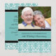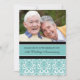 Carte d'invitation personnalisée pour la fête du 50e anniversaire de mariage dans un élégant motif damassé floral classique bleu turquoise, noir et blanc, délicat et moderne. Personnalisable avec les détails de votre fête et votre propre photo.