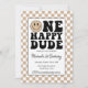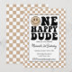 Invitation à la fête du 1er anniversaire de One Happy Dude. Fond à carreaux beige et accents noirs