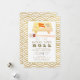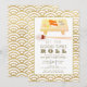 Cette invitation chic et moderne pour le réveillon du Nouvel An " Que les bons moments défilent" présente des sushis aquarellés sur une planche en bois avec des baguettes encadrées par un fond blanc avec des motifs de vagues en faux or. Le verso présente des motifs de vagues en faux or. Changez la couleur de fond à l'avant et à l'arrière et personnalisez-la selon vos besoins.