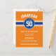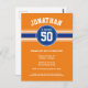 Des rayures Bleu Royal et un fond orange mettent en valeur cette carte d'invitation pour une fête d'anniversaire sur le thème du sport. Le design comprend un design de maillot de sport avec une zone pour mettre en évidence le nom et l'âge du garçon qui fête son anniversaire.