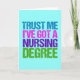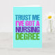 Faites-moi confiance, j'ai un diplôme en sciences infirmières. Un cadeau de fin d'études en sciences infirmières mignon et amusant pour une infirmière autorisée ou une infirmière autorisée ou diplômée pour devenir infirmière professionnelle. Jolie police turquoise, rose, violet et verte pour un look moderne cool.