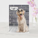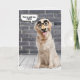 Un récupérateur d'or portant un drôle de masque de moustache sur un mur en brique grise et le parquet avec bulle vocale pour l'anniversaire de papa.