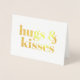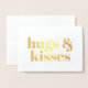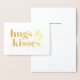 Cartes de vœux en relief à personnaliser avec une typographie moderne en gras « Hugs and kisses » (câlins et baisers). Texte en relief doré sur fond blanc.