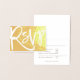 Une carte RSVP élégante avec une impressionnante impression de papier réel sur l'avant et l'arrière en or. Rsvp est placé dans une élégante typographie et balaie tout le front sur un arrière - plan de feuille réelle en or Personnalisez facilement vos initiales sur le dos, également imprimé en feuille réelle en or. L'intérieur est imprimé sans feuille et vous pouvez facilement changer les mots à vos propres exigences. Si vous souhaitez modifier le texte brun et la couleur blanche de l'arrière - plan à l'intérieur, vous pouvez le faire via l'option Customiser plus loin.