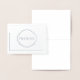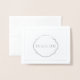Real Silver Foil Thank You Note Card est montré en blanc avec un nom d'échantillon et de bordure et d'impression d'accent dans un vrai papier argenté. Customisez cette carte et changez l'exemple de texte à vôtre avec ce modèle ou achetez comme indiqué.