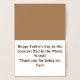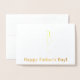 Carte Joyeuse Fête des Pères en feuille métallisée. Elle montre un bel oiseau sur fond blanc. Avec des textes noirs sur le devant et un fond marron et texte à l'intérieur de la carte.