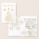 Image en feuille d'or d'un sapin de Noël élégamment décoré sur le devant de la carte. Le texte Joyuses Fêtes ! au-dessus de l'image. Le numéro 20 à gauche de l'arbre, le numéro 18 à droite de l'arbre. Les deux nombres forment l'année célébrée. Vous pouvez changer le numéro 20 et faire une carte pour n'importe quelle année du 21e siècle. Des images subtiles de flocons de neige à l'intérieur de la carte. Vous pouvez modifier ou supprimer le texte du modèle : Passez un Noël joyeux, gai, enjoué et Merry Christmas et une Bonne Année aussi ! Que la paix, la santé et la prospérité soient avec vous et les vôtres ! Avec amour, Marie. Le flocon de neige en feuille d'or est partiellement visible au verso de cette élégante carte en feuille d'or. Joyeuses Fêtes à vous et aux