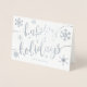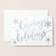 Cette carte de vacances en feuille d'argent pour les entreprises et les entreprises dispose d'une typographie de script moderne en feuille qui dit "Happy Holidays" accentué par des flocons de neige en feuille de papier. Ci-dessous est le nom de votre entreprise à personnaliser. À l'intérieur de la carte se trouve un salut en faux argent avec votre signature et une image de logo que vous pouvez customiser à votre propre. Conçu par l'artiste ©Susan Coffey.
