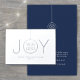 Envoyez simplement des souhaits de vacances élégants à vos clients, clients et associés d'affaires avec des cartes de fin de année de papier peint de marque élégante. Tout le libellé de ce modèle de carte pliée est simple à personnaliser. L'ornement de Noël, le logo et le texte à l'avant sont imprimés avec de la feuille d'argent métallique sur un arrière - plan blanc de base. (Pour obtenir de meilleurs résultats, l'image du logo téléchargée doit être en noir avec un arrière - plan blanc ou transparent.) Le design minimaliste moderne bleu marine et blanc présente un élégant ornement JOY chic et une typographie classique simple. Veuillez noter que l'intérieur est imprimé en couleur et non en papier métallique. Disponibles en petites quantités et en vrac, ces cartes conviennent aux petites entreprises et aux professionnels d'entreprise. Les clients d'affaires, les familles et les amis aimeront le luxe sophistiqué de ces cartes de voeux de vacances personnalisées. JOYEUSES FÊTES !