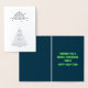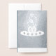 Cette superbe carte en feuille de Noël présente l'image art numérique d'un vaisseau spatial alien décoré de lumières de Noël aux couleurs vives. A l'intérieur de l'OVNI qui donne par la fenêtre, il y a un alien vert aux yeux noirs portant un chapeau festif de Père Noël. Il y a un cône de lumière venant de la soucoupe volante. L'ombre d'un message est projetée vers la Terre. Le message dit Ho Ho UFO. Salutations de vacances de l'espace pour tous les Terriens. Il y a plus de texte à l'intérieur pour que vous puissiez taper un message de bienvenue. Le design est en beau papier argenté pour le faire vraiment ressortir.