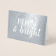 Cette carte magnifique et élégante est parfaite pour tous vos besoins de vacances ! Le devant de la carte a un fond en feuille d'argent véritable. Les mots "MERRY & bright" sont en blanc, dans une combinaison d'impression et de calligraphie au pinceau (pinceau). À l'intérieur, le message personnalisable se lit "que vos journées brillent de joie" dans une typographie argentée assortie.