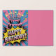 Cette image vibrante et amusante présente un gâteau d'anniversaire à deux niveaux avec des bougies éclairées, rendu dans un style pop art audacieux avec des lignes radiales rose et bleu et des motifs demi-teintes. Une bulle de discours jaune éclate avec les mots "HEUREUX ANNIVERSAIRE !" dans une police dynamique, inspirée de la bande dessinée.