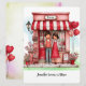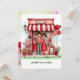 Personnalisez votre Saint-Valentin pour lui ou elle sur cette douce carte de vœux plate imprimée avec un adorable couple et leur scène de petite boutique excentrique remplie de petits cœurs, de ballons et de détails floraux. Modifiez vos noms, monogrammes et autres textes au recto et au verso. L'illustration de style aquarelle a un fond pastel abstrait au recto et au verso. Créé dans une palette de couleurs principalement rouges et roses, avec votre choix de tailles.