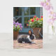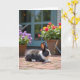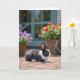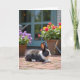 Cette carte représente un lapin noir et blanc se reposant sur une terrasse en briques chaudes, ses yeux sombres tournés doucement vers la droite comme s'il regardait quelqu'un en qui il a confiance ❤️. Les détails de la fourrure fine et les lignes des briques sont nets au premier plan, avec de minuscules brins d'herbe verte qui pointent entre les pierres comme de petits secrets partagés. À gauche se trouve un panier tressé rempli de fleurs violettes rondes, tandis qu'à droite un autre panier déborde de fleurs rouges et jaunes dorées qui ressemblent à une offrande joyeuse 🌼. Une porte ou un cadre de fenêtre sarcelle se dresse à l'arrière-plan, laissant entrevoir une maison confortable juste au-delà du jardin. La lumière du jour crée des ombres douces, donnant à la scène une atmosphère calme et affectueuse, comme un moment de tranquillité passé ensemble. De petits objets de jardin, notamment un arrosoir et quelques outils à main, apparaissent doucement en arrière-plan, suggérant des