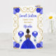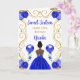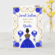Cette invitation de carte d'anniversaire sweet sixteen présente un cadre doré élégant, une belle princesse à la peau foncée et une robe bleue royale, des fleurs et un ballon.