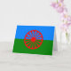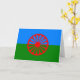 Ce dessin est orné du drapeau romani, qui est le drapeau international du peuple romani. Le drapeau est constitué d'un arrière - plan de bleu et de vert, représentant respectivement les cieux et la terre ; il contient également un chakra rouge à 16 branches, ou carrousel, au centre, qui représente la tradition itinérante du peuple romani et est aussi un hommage au drapeau de l'Inde. Le drapeau a été approuvé par les représentants de diverses communautés roms lors du premier Congrès mondial des Roms (WRC), qui s'est tenu à Orpington en 1971.