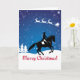 Une belle scène hivernale avec le Père Noël volant avec ses rennes dans le ciel tandis qu'un beau cheval de dressage exécute une figure au-dessus du message "Joyeux Noël". Si vous aimez ce design, veuillez consulter ma boutique Patty's Pet Art pour plus de créations équestres.