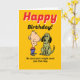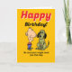 Cette drôle de carte de voeux d'anniversaire a été conçue avec une femme qui a récemment été dans un divorce ou une pause, en tête. L'extérieur présente des dessins colorés d'un homme et d'un chien, par lesquels l'expéditeur promet à la femme d'anniversaire un "chien" si le destinataire maintenant unique est gentil. L'intérieur identifie étonnamment le "chien" comme un homme, avec lequel le destinataire pourrait associer son ex-mari, ou son ex-petit ami. L'expression humoristique sur la carte capitalise sur la tendance familière des femmes à désigner les hommes infidèles, womaniseurs, ou tout simplement désordonnés dans les relations amoureuses comme des "chiens".