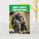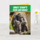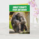 Ce chimpanzé en poche ressemble à votre mâle typique quand il n'arrive pas. Le recto de la carte dit, "Souriez ! Aujourd'hui c'est ton anniversaire !" A l'intérieur, il dit : "Demain, tu pourras retourner à être un vieil homme grincheux." Ouch ! Carte drôle pour le vieil homme grincheux de votre vie. Copier peut être modifié ainsi que les couleurs.