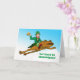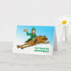 Qu'il y ait des shenanigans ! Carte de voeux amusante de la Saint Patrick avec un leprechaun tenant une bière et chevauchant une grenouille. La grenouille vole à travers le ciel bleu clair. Le leprechaun est habillé d'un costume vert, de bas rayés et porte un casquette vert. Copyright © Shoaff Ballanger Studios, 2024.