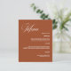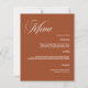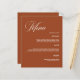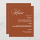 Arrière - plan de couleur orange brûlé. Personnalisez et ajoutez vos noms, votre date et le menu. Texte blanc. 1 feuille = 1 menu imprimé bord à bord.