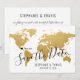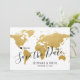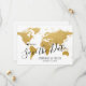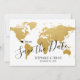 Faites savoir à vos invités la date de votre mariage de destination romantique avec cette belle carte du monde en or enregistrer la carte de date avec votre destination personnalisée marquée d'un marqueur de localisation de cœur éditable mobile. Déplacez le cœur et tapez un nouveau nom de ville ou de pays pour personnaliser complètement cette invitation de destination de thème de voyage carte du monde en or.