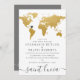 Invitation chic et moderne en carte du monde dorée pour un mariage sur le thème de la destination ou du voyage - déplacez le cœur vers n'importe quel endroit et ajoutez le nom de la ville ou du pays en bas pour créer une élégante invitation de mariage dorée et grise. —— Cliquez sur PERSONNALISER POUR ALLER PLUS LOIN pour déplacer le cœur, changer la couleur de fond et de texte, changer les polices, ou réorganiser entièrement et créer votre propre design en utilisant notre unique carte dorée en faux-foiling. —— Parfait pour les lieux de mariage de destination tropicaux, de plage, d'île, de ville, de montagne et d'aventure partout dans le monde. Consultez notre boutique de créateur pour des articles coordonnés !