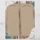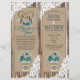Bois rustique avec dentelle blanche et bouquet floral bleu respirant pour bébé en pot de mason avec burlap, dentelle, et tailles de ficelle sur le texte à l'allure lin arrière - plan et le coeur gravé avec programme de mariage de style campagnard monogramme.