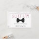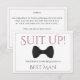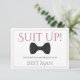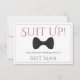 Utilisez cette "carte de proposition du meilleur homme" pour demander à votre ami spécial, frère ou autre membre de la famille d'être le meilleur homme de votre mariage. Il présente un design amusant avec du texte rose rose ou mauve poussiéreux et une image d'une cravate arc noir sur un arrière - plan blanc et dit : Conforme à toi! Vos services sont demandés en tant que meilleur homme" Il y a un espace pour entrer une note spéciale demandant "serez-vous mon meilleur homme?" ainsi que les noms du couple mariage et la date du mariage. Tous les champs sont entièrement personnalisables.