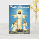 Designed with a robed, kind-faced man at the center, this digital illustration shows him standing on an old stone bridge with his arms open as if welcoming someone close. A radiant golden sunburst circles his head, sending warm rays into a blue-to-teal sky that feels calm and intimate. Three small, childlike winged figures kneel on either side, their hands clasped and their upward gazes meeting his gentle attention in a way that reads like quiet affection and care 🐰. The bridge looks weathered and touched with moss, while a deep blue drop beneath it adds a sense of hush and distance. At the top, the words “Easter Blessings” sit in flowing cursive lettering in a light tone that stands out against the sky. Near the bottom, “For you, Mother” appears in smaller, delicate cursive text, placed low and centered like a private note 🌷. Green foliage edges the scene around the bridge, contrasting with the dark space below and the golden rays above.
