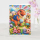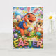 Scription celebrate Easter with a prehistoric twist this adorable greeting card stars wrecked the dinosaur and hoot the owl both dressed up in cute bunny ears for the ultimate Easter egg hunt surrounded by a garden full of colourful eggs spring flowers and butter butterflies. This vibrant Easter card is perfect for kids and families the high-quality illustration and bright cheerful colours make it a standout choice for sending warm holiday wish