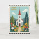 This Easter card shows a peaceful countryside scene centered on a small white chapel with arched windows and a red-roofed steeple topped by a simple cross. A postage-stamp style border frames the artwork, giving it a cozy, old-fashioned look. A pale blue sky with soft white clouds hangs above rolling green hills, while tall evergreen trees stand on either side like quiet companions. A light gray path runs straight to a dark wooden door, inviting two friends to stroll up together and share a gentle moment. In the foreground, a garden overflows with red and golden tulips 🌷, white lilies, and yellow sunflowers, their petals leaning toward one another as if in a tender greeting. The words “HAPPY EASTER” appear in the upper left in golden letters, set neatly against the sky for easy reading. The colors stay soft and springlike, with the bright flowers adding warmth against the calm greens and blues 🐰. The chapel sits slightly above the flower beds, with the path dividing the garden into two balanced sides.