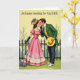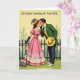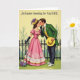 Designed with a nostalgic spring look, this Easter card centers on a couple standing close together on a pale yellow background that feels softly sunlit 🌷. The woman wears a full pink gown with puffed sleeves and pearl-like trim, paired with long black gloves and a yellow hat topped with a small purple flower. She leans in with a tender, almost teasing tilt, her gloved hand lifted near the man’s chin as if guiding his attention toward her. The man faces her in a green jacket, yellow waistcoat, and dark trousers, holding a yellow hat at his side while he bends closer like he’s about to whisper something sweet 🐇. Near the bottom, a small cluster of purple, white, and blue flowers sits by her feet, adding a gentle seasonal touch. Behind them, a simple fence line and thin tree branches frame the scene without distracting from their close, affectionate gaze. The message “An Easter Greeting for My WIFE” appears prominently across the upper area in dark lettering against the light background.