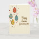 This card features four decorated egg shapes hanging down the left side on dotted strings, creating a sweet, festive scene 🐰. One egg is deep red with small golden floral details, another is teal with red stripes and tiny stars, a third is dark blue with white flower shapes and golden zigzag bands, and the last is sunny yellow with red and blue starbursts. The background is a soft cream tone with faint vertical stripes, giving the colors room to stand out without feeling busy. Small red hearts drift around the eggs, and a few tiny butterflies with golden wings float nearby, like they’re circling a gentle bond between giver and receiver 🌷. On the right side, the greeting “Happy Easter Granddaughter” appears in flowing brown lettering, taking up most of the open space. The text sits centered on the right half, with the words stacked neatly so they feel close and affectionate next to the hanging eggs. The hearts and butterflies are scattered mostly between the eggs and the message, with a few tucked near the top and middle of the design.