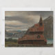Ce dessin présente une peinture de l'artiste norvégien Knud Baade (1808-1879). Il montre l'église Urnes Stave, qui est une église en stave du XIIe siècle à Ornes, en Norvège. Une église de stave est une église chrétienne médiévale en bois, autrefois commune dans le nord-ouest de l'Europe. Le nom provient de la structure de construction de poteaux et de linteaux du bâtiment, un type de charpente de bois où les poteaux de minerai portants sont appelés "stafr" dans le Vieux Norse. Il y a des montagnes majestueuses derrière l'église en bois, et le ciel est nuageux et atmosphérique. Devant l'église se trouve un mur en pierre traditionnel, à côté duquel se trouvent des champs et des arbres. L'art original a été peint par Knud Baade en 1832.