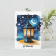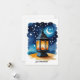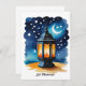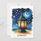 L'image est une carte d'Eid créée numériquement représentant une lanterne traditionnelle sur un fond de ciel nocturne. La lanterne est l'élément central, représentée avec des motifs complexes et une lumière chaude et lumineuse émanant de l'intérieur, suggérant qu'elle est allumée. À l'intérieur de la lanterne, une silhouette d'une mosquée ou d'une structure architecturale similaire peut être vue, renforçant le thème de l'Eid. L'arrière-plan est une peinture de style aquarelle d'un ciel nocturne bleu foncé parsemé d'étoiles et d'un croissant de lune, communément associé à l'imagerie islamique et à la célébration de l'Eid. L'esthétique globale est douce et rêveuse, avec l'effet aquarelle ajoutant une touche d'art à la carte. La palette de couleurs est dominée par les bleus, les oranges et les jaunes, créant un contraste visuellement attrayant. La carte vise probablement à transmettre une ambiance festive et spirituelle, appropriée pour