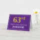 L'avant de cette carte de voeux d'anniversaire luxueuse et fantaisie comporte un grand numéro ordinal "63ème" avec un look d'inspiration fausse/imitation or, le message "HAPPY 63ème anniversaire", un nom de destinataire personnalisé, et un motif de frontière composé de lignes fines, sur un arrière - plan de couleur violette. L'intérieur comporte un message d'anniversaire personnalisé, ou pourrait être effacé et laissé vide si un message doit être écrit à la main à la place. Une carte de voeux d’anniversaire modifiée comme celle-ci pourrait être envoyée pour célébrer le soixante-troisième anniversaire de quelqu’un. [~Z0000484]