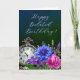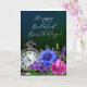 This belated birthday card showcases a classic vintage clock surrounded by vibrant florals in shades of purple, blue, and pink, set against a smooth blue–green gradient background. The bright botanical cluster adds a warm, uplifting touch to the late birthday message, creating a thoughtful and elegant front design.