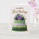 A sophisticated birthday card featuring a beautifully decorated two-tier cake adorned with purple floral accents, lush greenery, and gold details. The elegant design paired with shimmering “Happy Birthday” lettering makes this card perfect for celebrating someone with timeless style and grace.