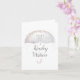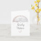 Une jolie carte de remerciement féminine pour bébé ou nuptiale avec des confettis en parties scintillant d'or rose qui tombent sur un parapluie d'aquarelle gris doux avec un grand nom de calligraphie modifiable.