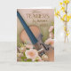 This Teacher's Day greeting card for a music teacher features a beautifully displayed violin surrounded by soft pastel flowers including peach gerberas, pale pink ranunculus, and creamy buds. The front message reads Warm Teacher’s Day Wishes to a very special music teacher! The design blends beige and olive hues, giving it a graceful, calm, and artistic look — perfect for honoring educators who inspire through music.