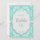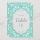 Carte élégante de numéro de table Menthe et Grise. Créée avec du vert mousse de mer, de l'aqua et du gris avec un style de dentelle antique, ce design est idéal pour les mariages élégants et traditionnels. Des fournitures de mariage coordonnées supplémentaires sont disponibles chez MetroEvents sur Zazzle.