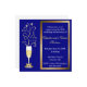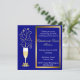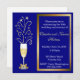 Carte élégante d'invitation à une fête d'anniversaire de mariage, faite avec un carton recyclé ayant un fond bleu, un texte blanc et des accents dorés. Un verre à champagne avec un nœud doré sur la tige laisse échapper des étoiles scintillantes, et un cadre doré entoure la zone de texte. Personnalisez tout le texte pour votre fête. Invitation très somptueuse.