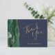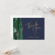 Cette élégante carte de remerciements mariage moderne est ornée d'une bordure en aquarelle vert émeraude et bordée d'une parties scintillant en faux or. Le texte personnalisable combine les mots "Merci" en écriture manuscrite couleur or et les noms de la mariée et du marié en caractères italiques sur un arrière - plan bleu marine. Ajoutez votre propre message personnel à l'envers.