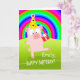 Cochon de fête dansante, carte d'anniversaire avec zone pour ajouter un nom sur la couverture. Peinture numérique avec arc-en-ciel coloré, cochon avec casquette d'anniversaire et cadeau, et herbe verte. Danse, danse, message de danse écrit à l'intérieur. Copyright © Shoaff Ballanger Studios, 2022.